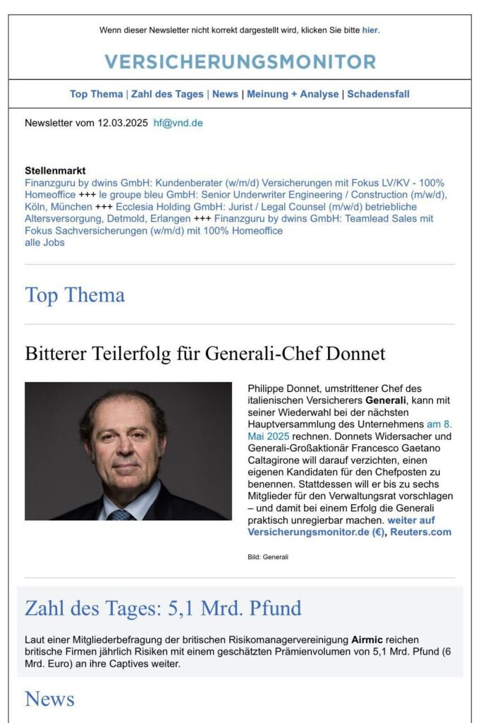 Der kostenlose Newsletter mit sorgfältig ausgewählten Nachrichten aus der Versicherungswirtschaft wird von Montag bis Freitag am Nachmittag per E-Mail versandt.